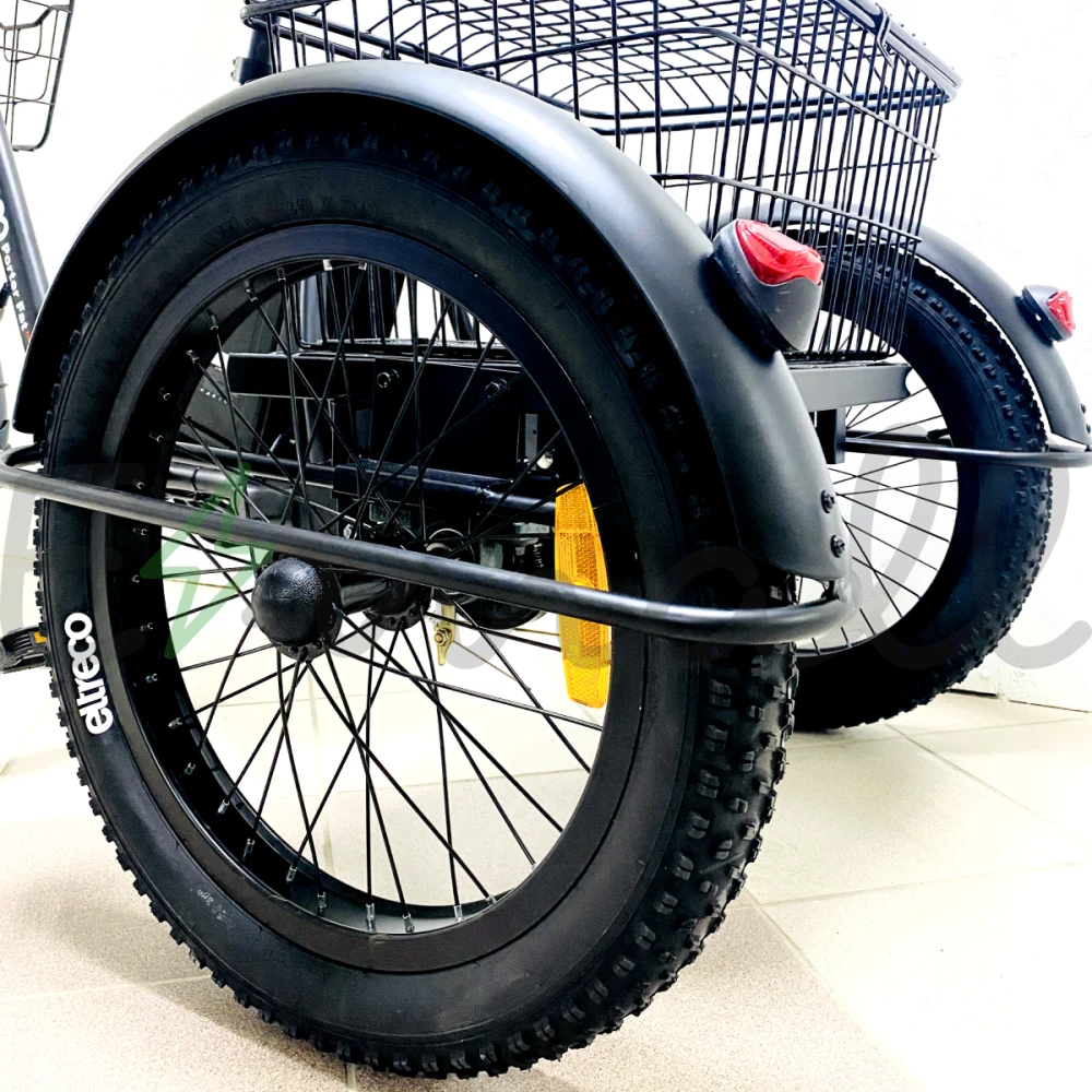 ТРИЦИКЛ ELTRECO PORTER FAT 700 работает от выносливой аккумуляторной батареи, на нем можно проехать до 70 км. Имеет стильные светодиодные фары, стальные полноразмерные крылья. Впереди на руле расположена легкая корзина, сзади – большая вместительная.