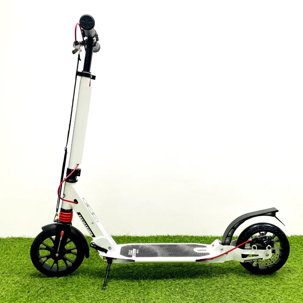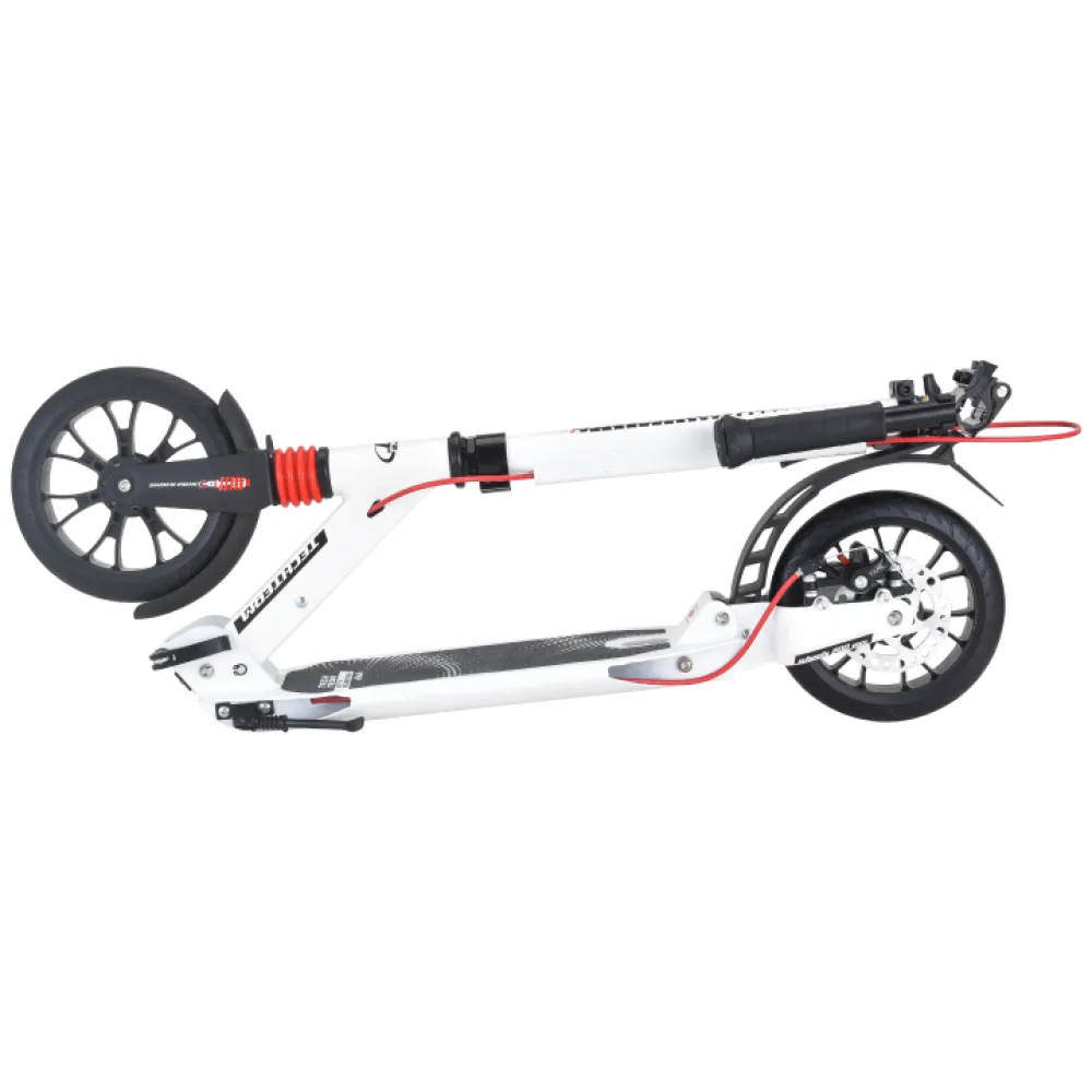 Самокат оснащен ручной дисковой тормозной системой. Украшенная по последнему писку моды техника привлекает внимание эстетически и технически.
